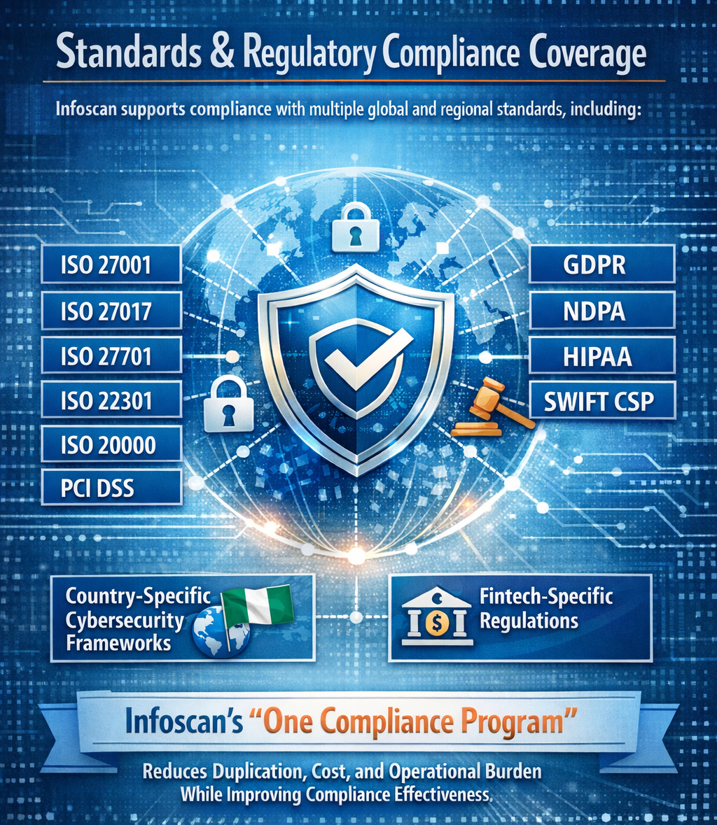 Infoscan delivers comprehensive cybersecurity and data privacy compliance services, supporting organizations in meeting global, regional, and industry-specific regulatory requirements. Our approach enables sustainable compliance while reducing duplication, operational complexity, and overall cost.